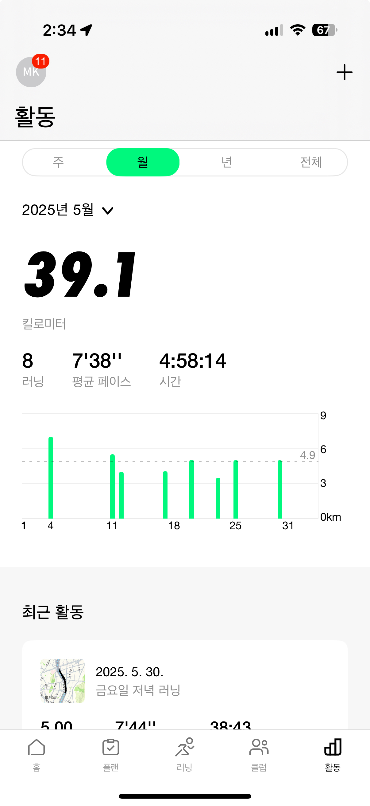 이번달은 너무 바빠서 제대로 못뛰었더니 확실히 체력이 떨어진게 느껴진다.